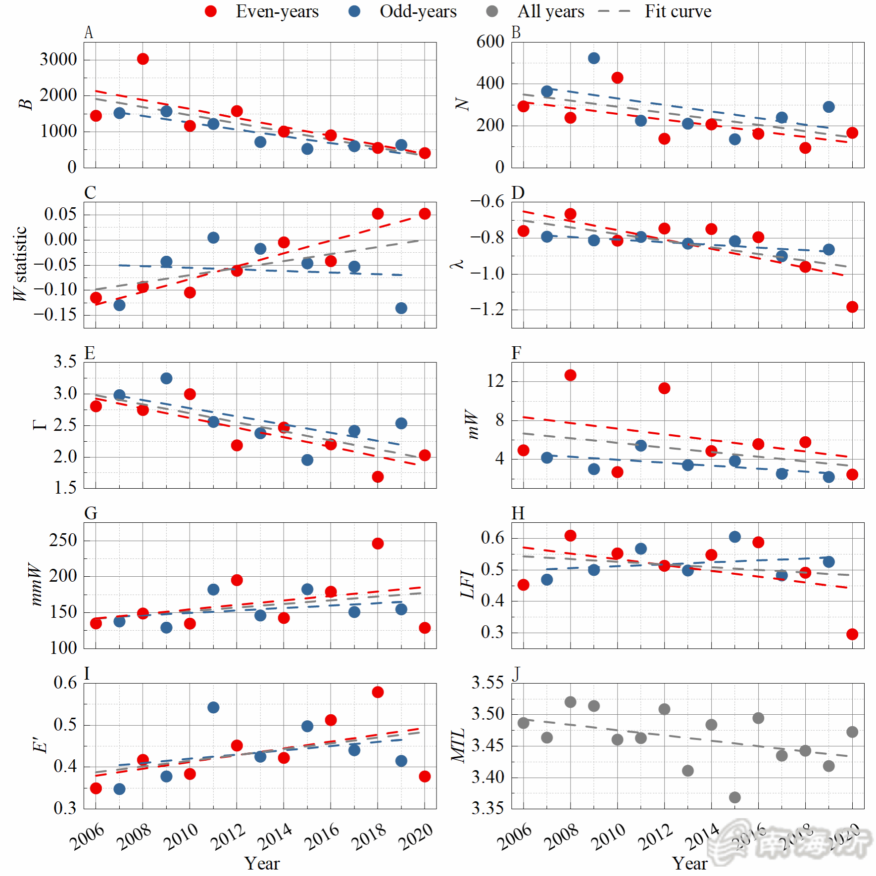 图1. 北部湾渔业资源群落10项生态指标的年际变化趋势