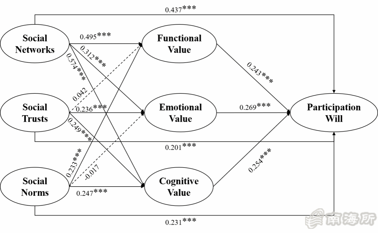 本研究探讨了影响我国小型渔业渔民参与基于turf的渔业管理制度意愿的因素,包括社交网络、信任、规范(社会资本的组成部分)以及功能、情感和认知价值观(感知价值的维度)。研究发现,社交网络、信任和规范对渔民的参与意愿有显著的正向影响,路径系数分别为 0.437、0.231 和 0.201。同样,功能、情感和认知价值观也对参与意愿有正向影响,路径系数分别为 0.243、0.269 和 0.254。此外,社会网络在提升感知价值方面至关重要,尤其是影响功能价值和认知价值(路径系数分别为 0.495 和 0.574)。然而,社会信任对功能价值的影响和社会规范对情感价值的影响在统计上并不显著。这些发现揭示了在制定和应用基于turf 的小型渔业管理战略时考虑社会资本和感知价值的综合影响的重要性。因此,加强社会网络和规范,以及阐明该系统在渔业社区内的多方面价值,可以较大程度提高小型渔业渔民的参与度和系统效能。本研究初步确定了影响我国小型渔业渔民参与基于 turf 管理意愿的因素,为未来此类管理系统的开发和实施提供了实证支持。